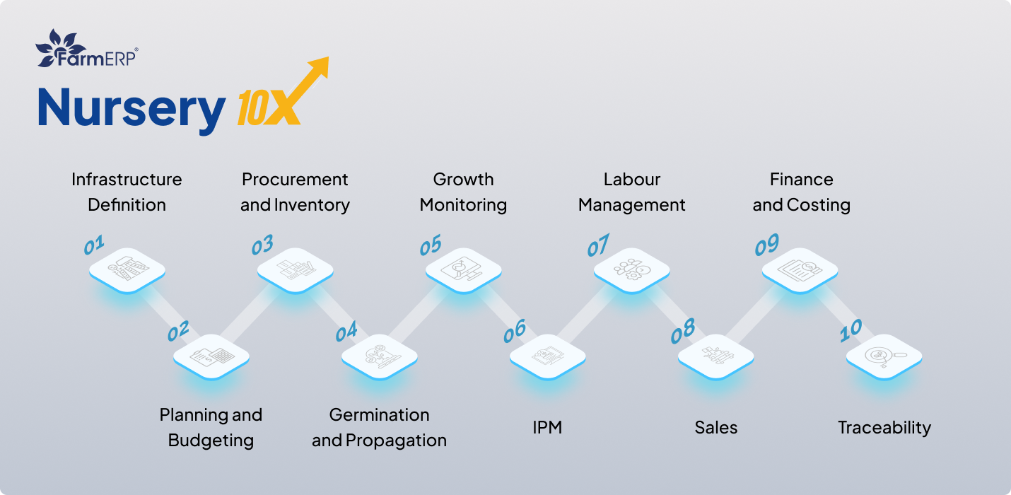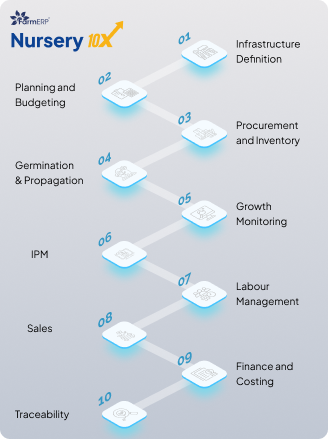 NurseryOps10X tackles every challenge of modern nursery management, from planning and batch tracking to sales and traceability. Built for precision and scale, it automates job cards, quality checks, and inventory flows so you can nurture each seedling toward maximum yield and profit.